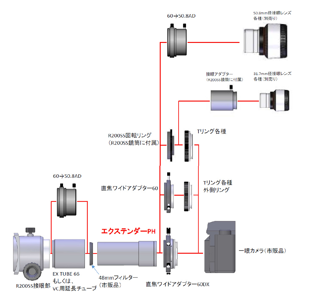 ■すでに「R200SS鏡筒」をお持ちの方もF5.6高性能アストログラフとしてリニューアルできます。周辺光量が豊富な「R200SS鏡筒」にて、放物面特有のコマ収差を高いレベルで補正することで広いイメージサークル周辺でも明るく鋭い星像を結びます。31.7mm接眼レンズと接眼アダプターの併用により眼視観測にも対応します。