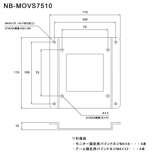■VESA規格100×100mm穴はM4ネジ切り加工を施しています。