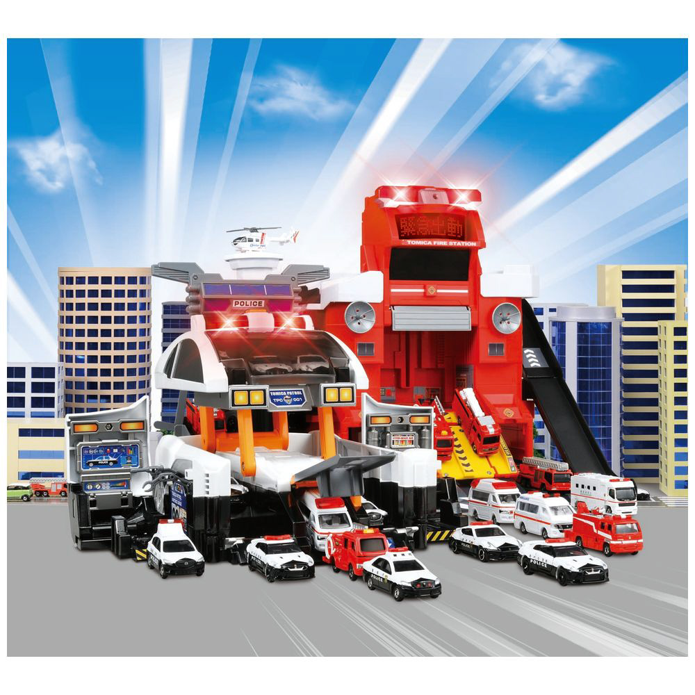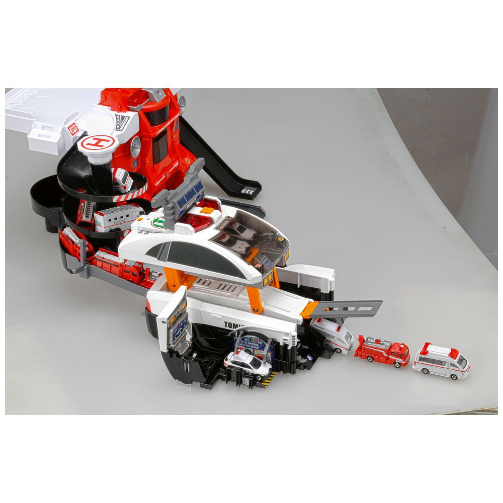 ファイヤーステーションのスパイラルスロープからデカパトロールカーの後部ハッチを連結させることで最大10台以上のトミカを一斉発車させて遊ぶことができます。