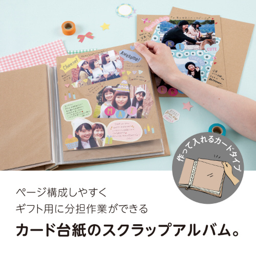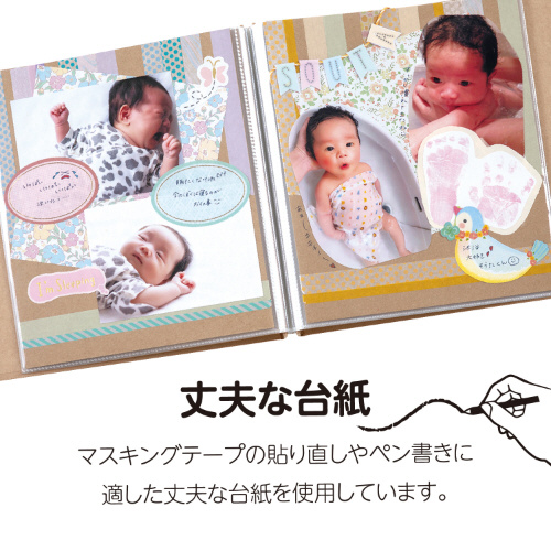 高透明ポケットに、丈夫な厚口の台紙が1枚ずつ入った、スクラップ・デコレーションに最適なアルバム。
