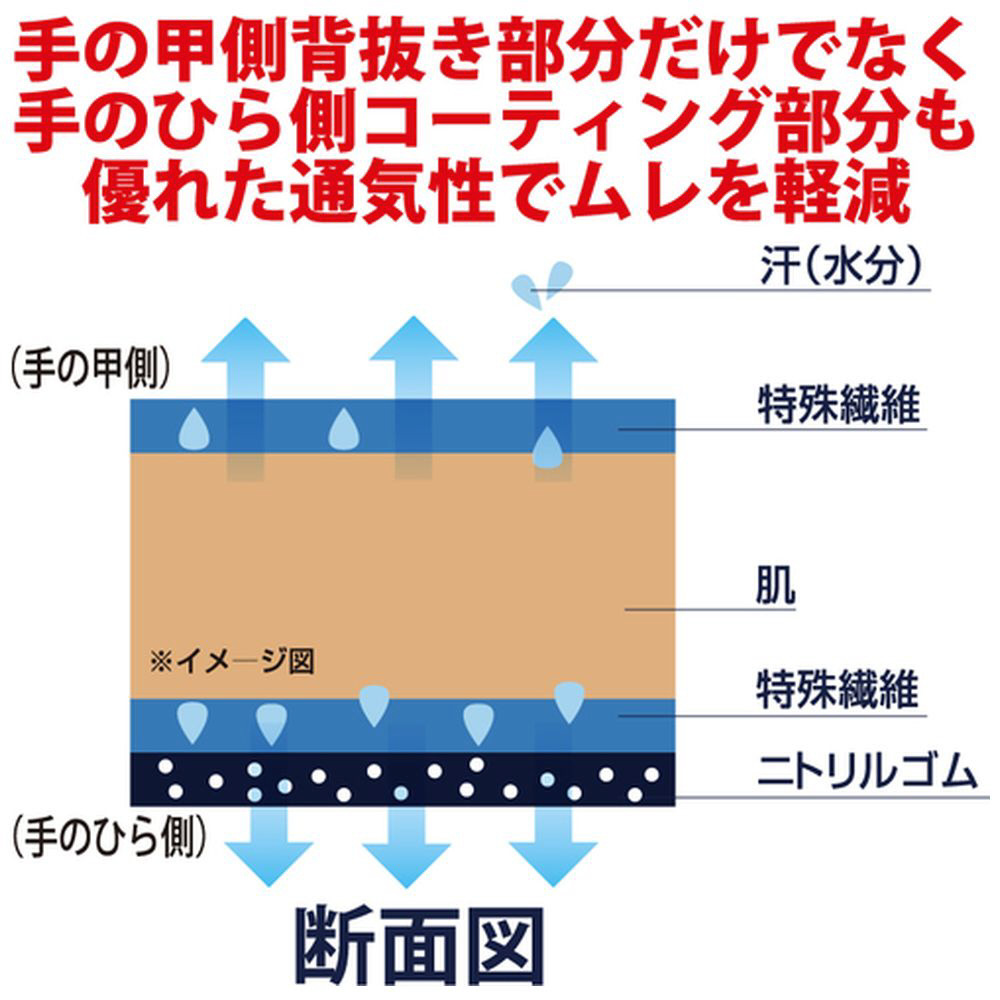 ■汗を吸収&放出する特殊繊維を使用しているため、従来の手袋よりさらさら感がアップしています。