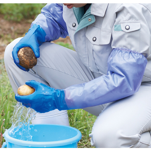■手袋部は塩化ビニール製のため、天然ゴム製の手袋に比べて油や洗剤に強い手袋です。