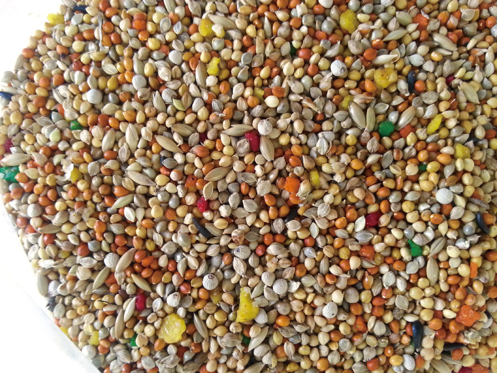 鮮やかな見た目とフルーティーな香りが鳥たちの食欲をそそります。健康に配慮し、殻付きの原料のみを使用し、キビ原料の完全不使用。