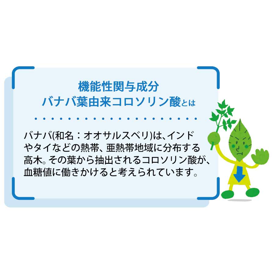 血糖値が高めの方に ※空腹時血糖値100〜125mg/dL 機能性関与成分 バナバ葉由来コロソリン酸 丸型タブレット 合成着色料・香料、保存料すべて無添加 <届出表示> ●本品にはバナバ葉由来コロソリン酸が含まれます。バナバ葉由来コロソリン酸は、血糖値が高めの方の血糖値を下げる機能が報告されています。