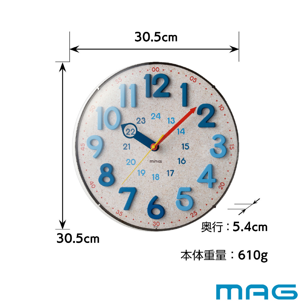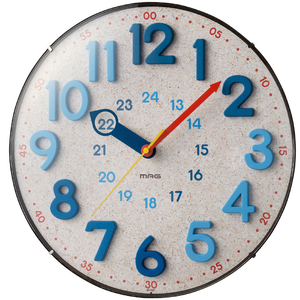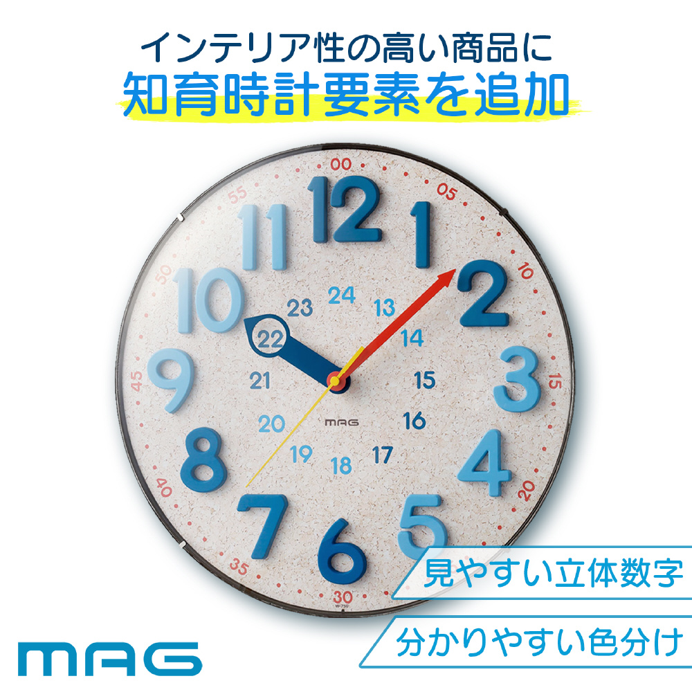 立体数字と時分針の配色を合わせることにより、時計の読み方をお子様にわかりやすく且つ教えやすい仕様です。