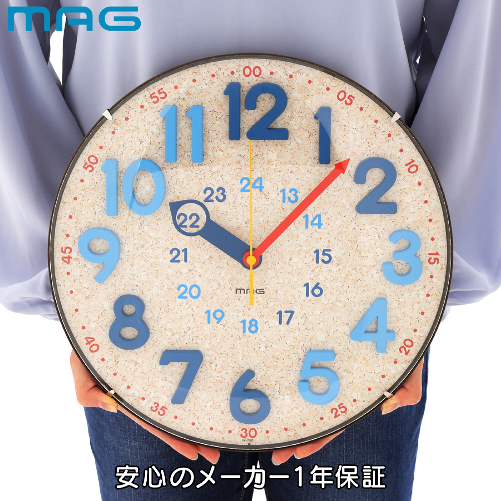 コルク風の文字板、かわいさと爽やかさを併せ持ったブルーの数字ブロックとカラーバランスがおしゃれさが人気の時計です。