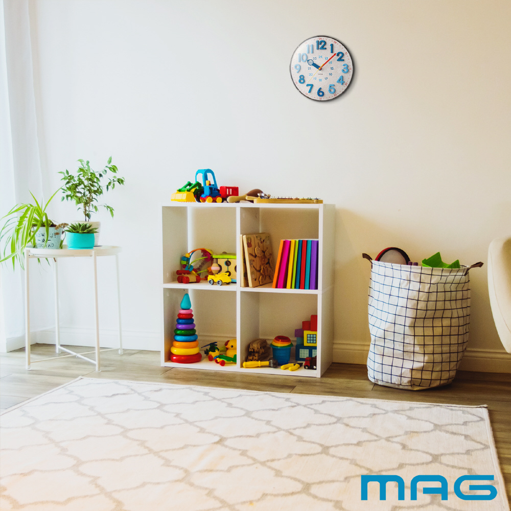 コルク調デザインの文字板が、お子様のお部屋に使われることの多いジョイントマットなどのインテリアとも好相性。