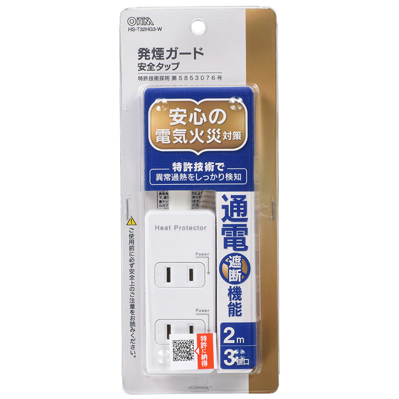 発煙ガード安全タップ HS-T32HG3-W [2.0m /3個口 /スイッチ無]