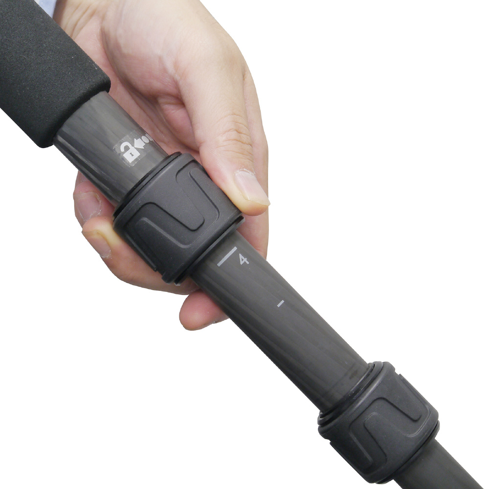 高精度研磨を施し伸縮性能を上げたカーボンファイバーパイプと、軽量金属マグネシウム素材を多用。高い剛性と快適な携帯性を誇ります。交換式石突採用でリニューアル