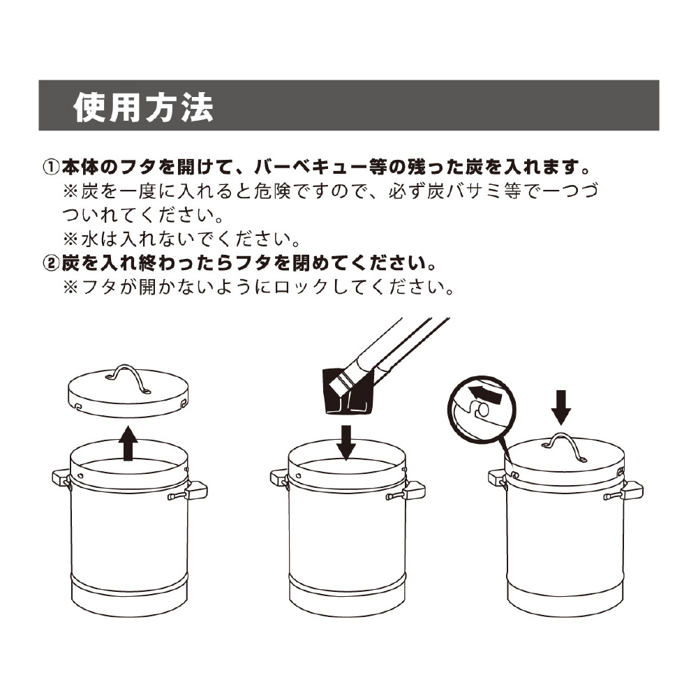使用した炭を、水を使わず密閉消火!