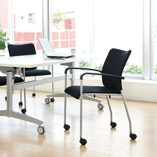 コーディネートしやすいシンプルデザインの「GK−30シリーズ背クロスタイプ」キャスター脚タイプのミーティングチェア(肘なし)/ブラック。ラウンド形状のパイプフレームに張りのあるクロスが体を心地よくサポートするクロステンションバックを採用。引き締まったブラックの背座カラーに、シルバー色のパイプ脚が全体的にスリムなシルエット。ミーティングスペースを軽やかに演出します。4脚までスタッキングできて省スペース収納が可能。移動に便利なキャスター付きです。●座面までの高さ: 440mm●座面寸法: W430×D420mm●カラー: ブラック●材質: 背=布、座・芯材=樹脂成型品、クッション=チップウレタン+スラブウレタン、張地=布(ポリエステル)、脚=スチール(粉体塗装)、キャスター=φ50mmナイロン双輪キャスター●機能: スタッキング(4脚) 【組立・設置】料金が含まれます。ただし、以下の場合は別途料金が発生する場合がありますので営業担当までご相談ください。 - 土・日・祝日指定、時間指定の納品 - 特殊地域(北海道、沖縄、離島、山間部等の一部地域)への配送 - エレベーターのない2階以上への納品 - その他お届け先の条件がある場合や一度に大量注文を頂いた場合