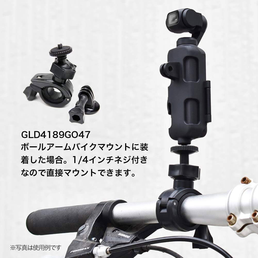 また、三脚用ネジ穴も付いており、三脚・自撮り棒などに直接、取り付けができます。なお、GLIDER社製三脚用ねじ付きアダプター(GLD9993GP60BX)と共に使用すれば、様々なアクセサリー(自転車・バイクのハンドル等)へのマウントが可能です。