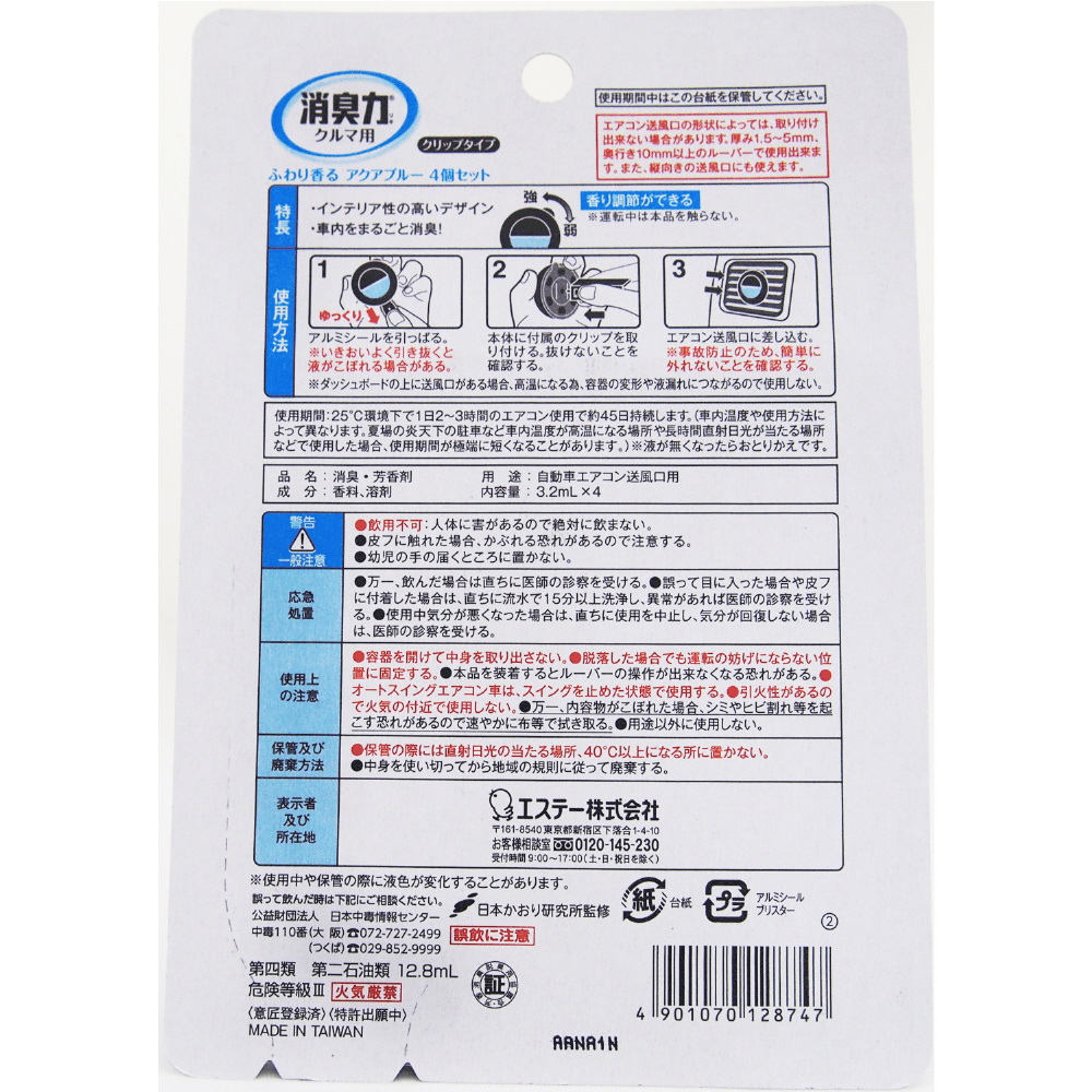 クルマの消臭力 クリップタイプ アクアブルー 3.2ml×4個セット [車用 消臭剤 芳香剤] アクアブルー