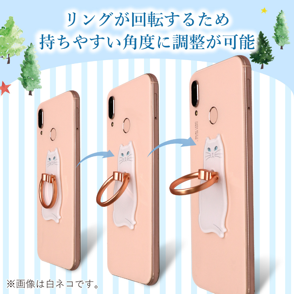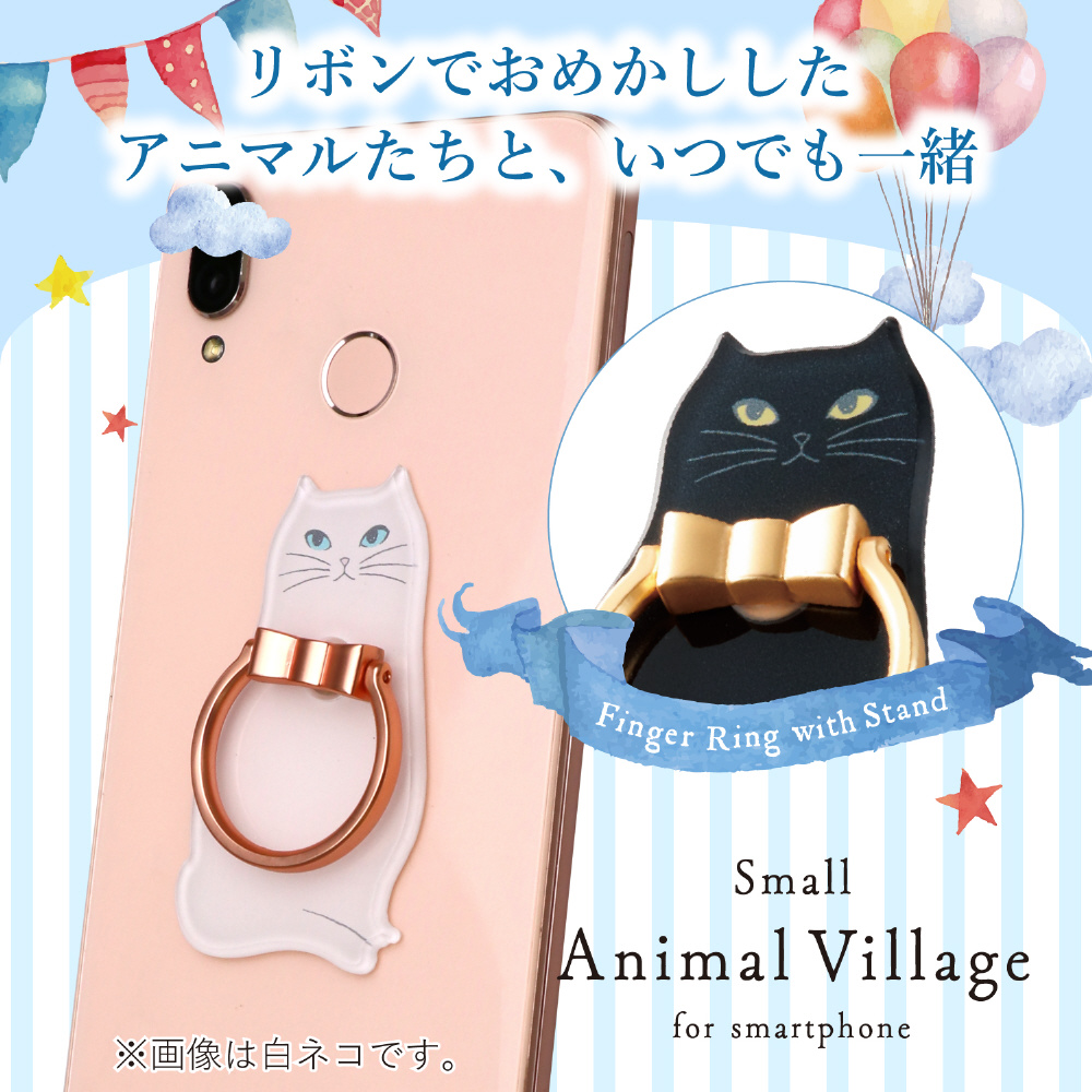 リボンでおめかししたアニマルたちと、いつでも一緒。 背面に貼りつけてスマートフォンの落下を防ぐ、リング部分のリボンが蝶ネクタイのようにかわいいフィンガーリング。