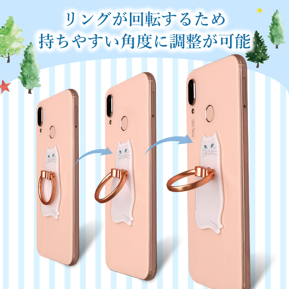 リボンでおめかししたアニマルたちと、いつでも一緒。 背面に貼りつけてスマートフォンの落下を防ぐ、リング部分のリボンが蝶ネクタイのようにかわいいフィンガーリング。