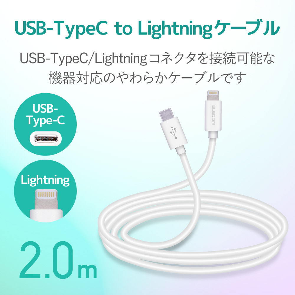 iPhone 充電ケーブル Type-C ライトニングケーブル 2m PD 対応 MFi認証 超急速 やわらかい スリムコネクタ 【 Lightning コネクター搭載 iPhone iPad iPod AirPods 対応 】 タイプC ホワイト MPA-CLY20WH