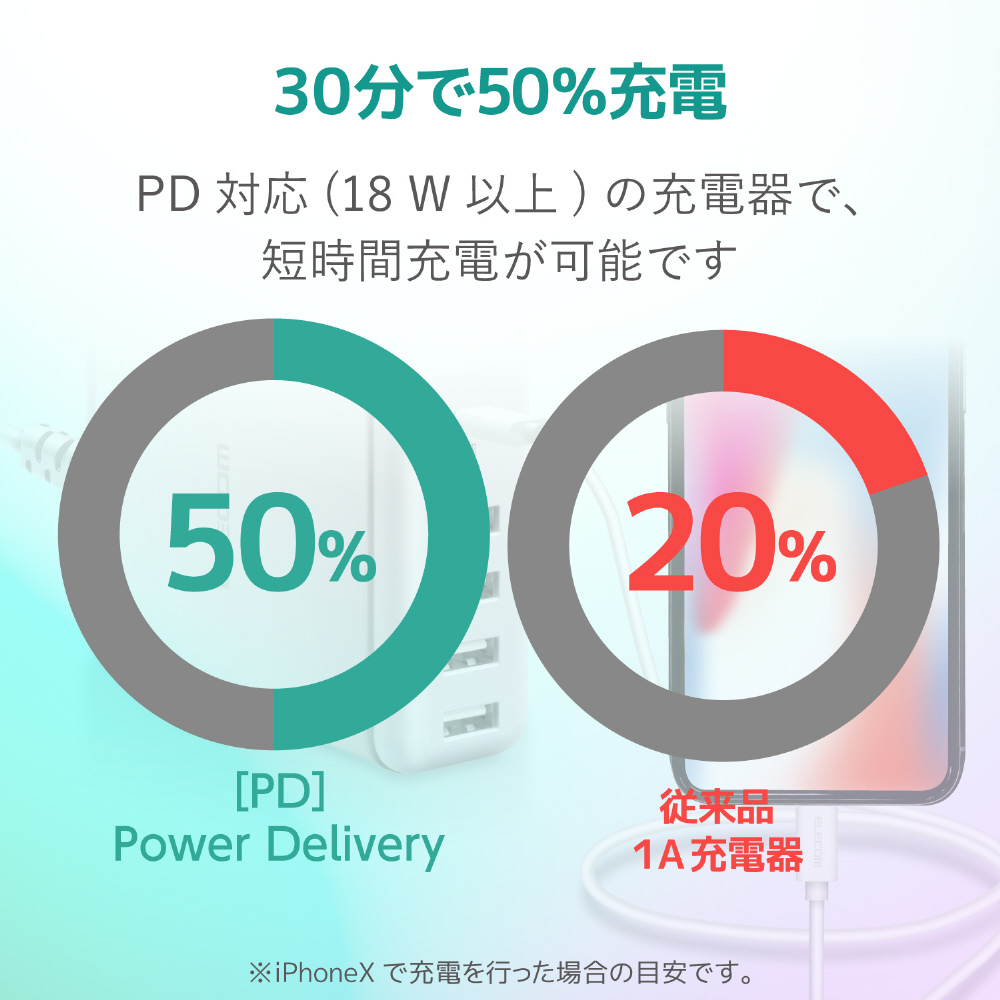 ■USB Power Deliveryに対応し最大20V 3A(60W)の大電流を送電可能で、iPhoneの高速充電に対応しています。
