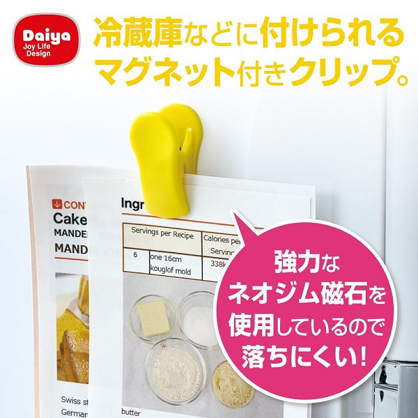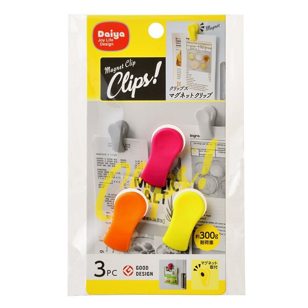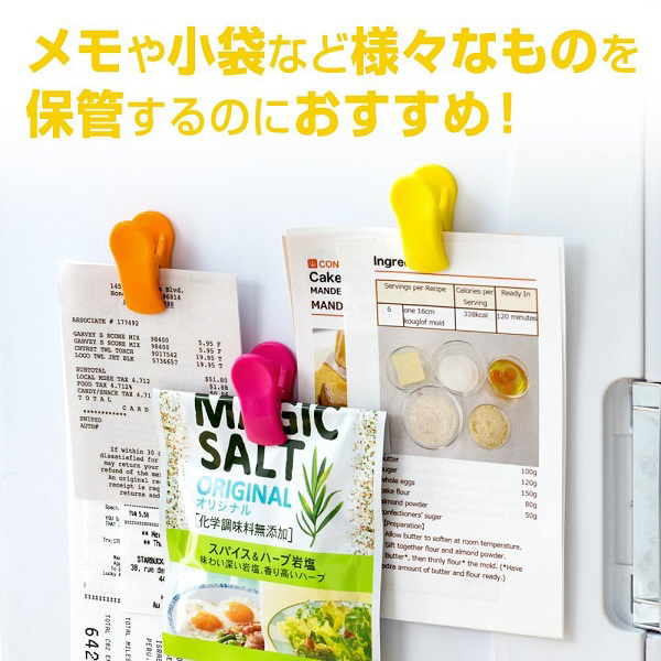 マグネット付き。冷蔵庫などに付けられる便利なマグネット付きクリップ。グッドデザイン賞受賞。つまみやすく開きやすい、指先にフィットするつまみはグッドデザイン賞を受賞しています。メモの保管に便利。冷蔵庫やスチール製品などの磁石が付く金属面に使用できます。