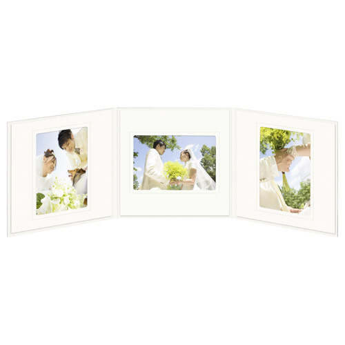 中額はタテ・ヨコどちらの写真にも対応する後付けタイプです。中額の中抜きの外周に施した空押しのライン装飾が写真を引き立たせます。