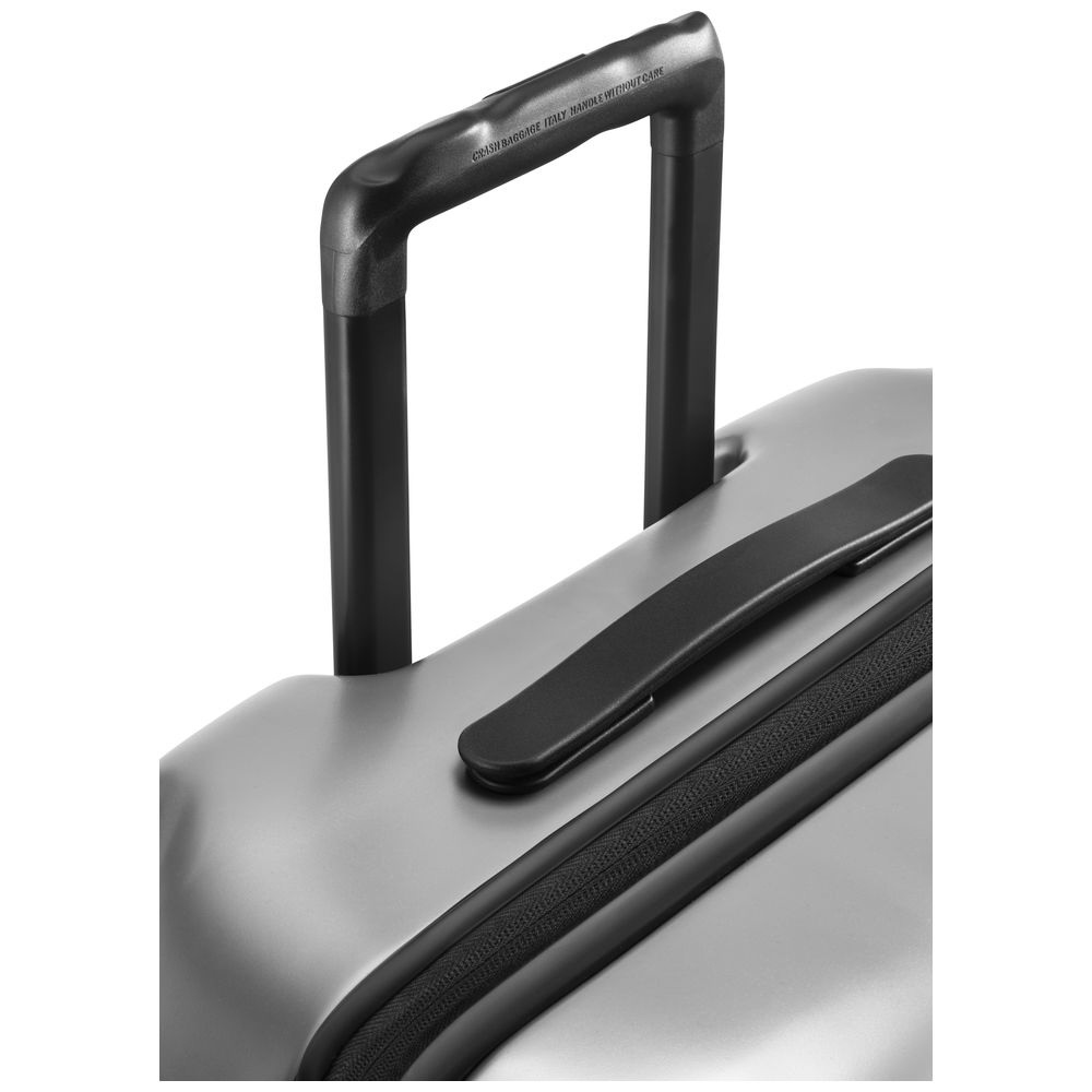 一層の安定と快適な動きのために4つの稼働ホイールを搭載しているので、スーツケースを斜めにしなくても、縦のまま移動できます。軽いアルミ製のハンドルは、伸縮できる取っ手が3段階の高さで固定できるので、自分の身長や状況に合わせて長さを変えられる設計です。