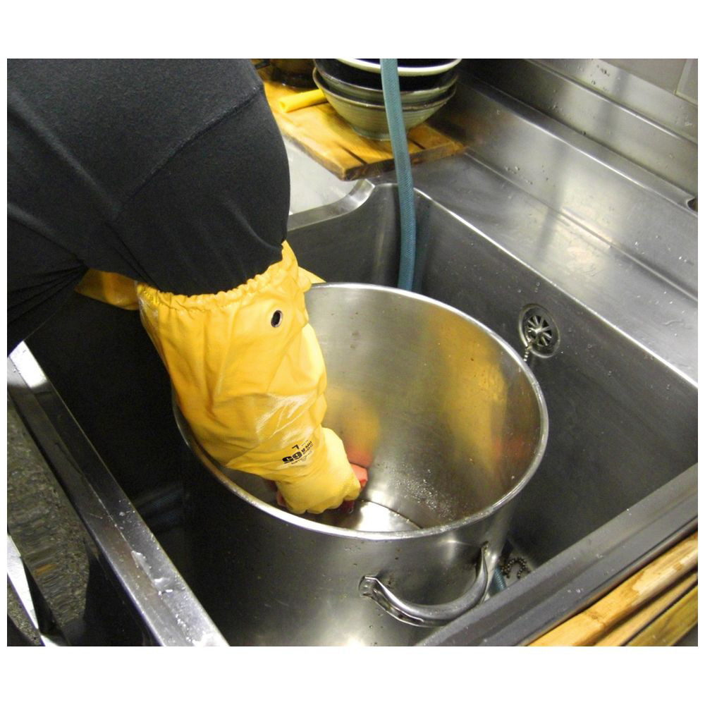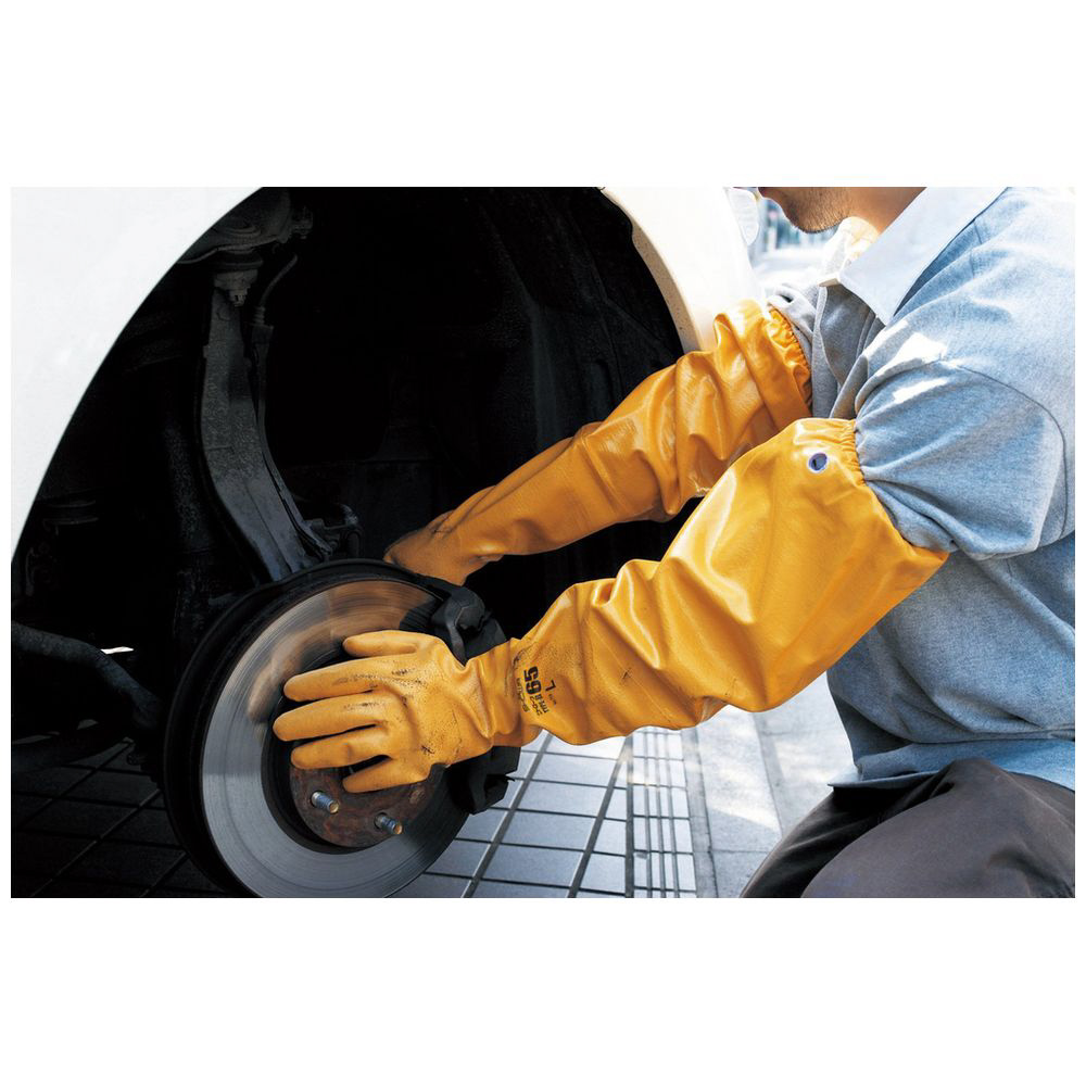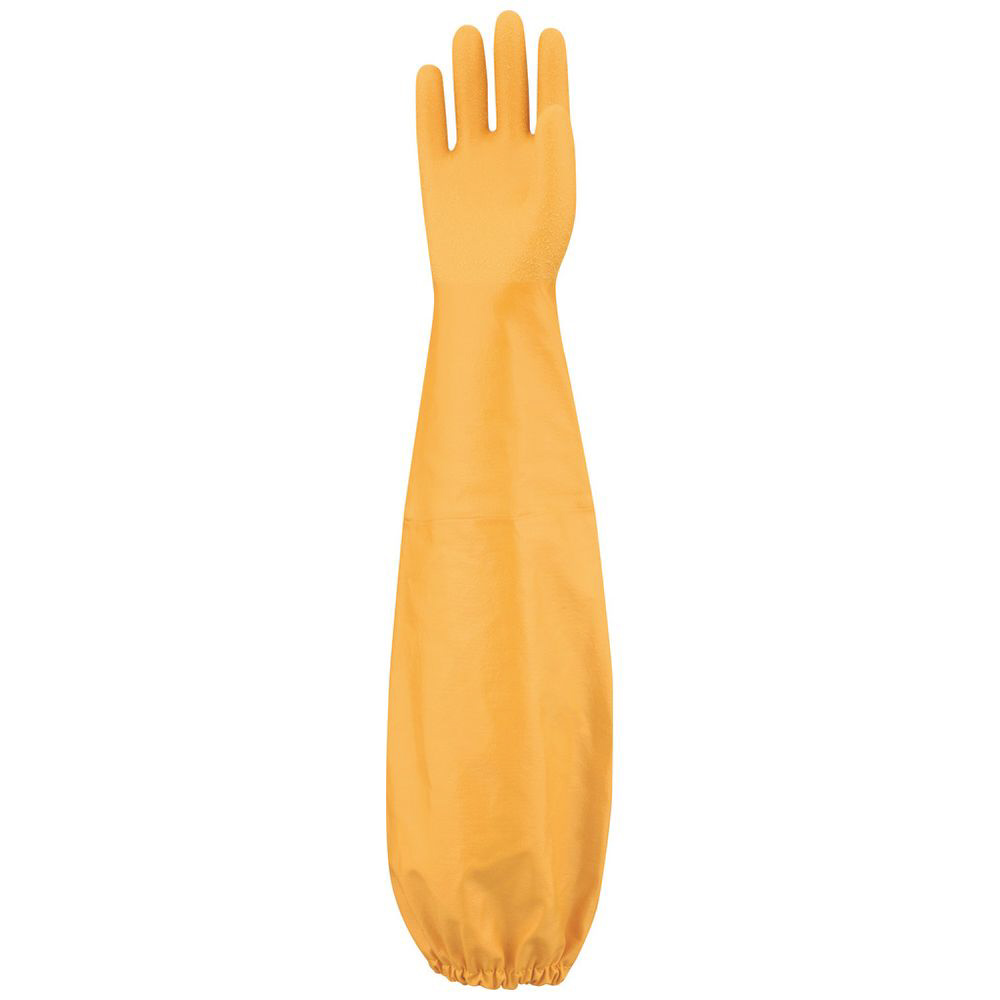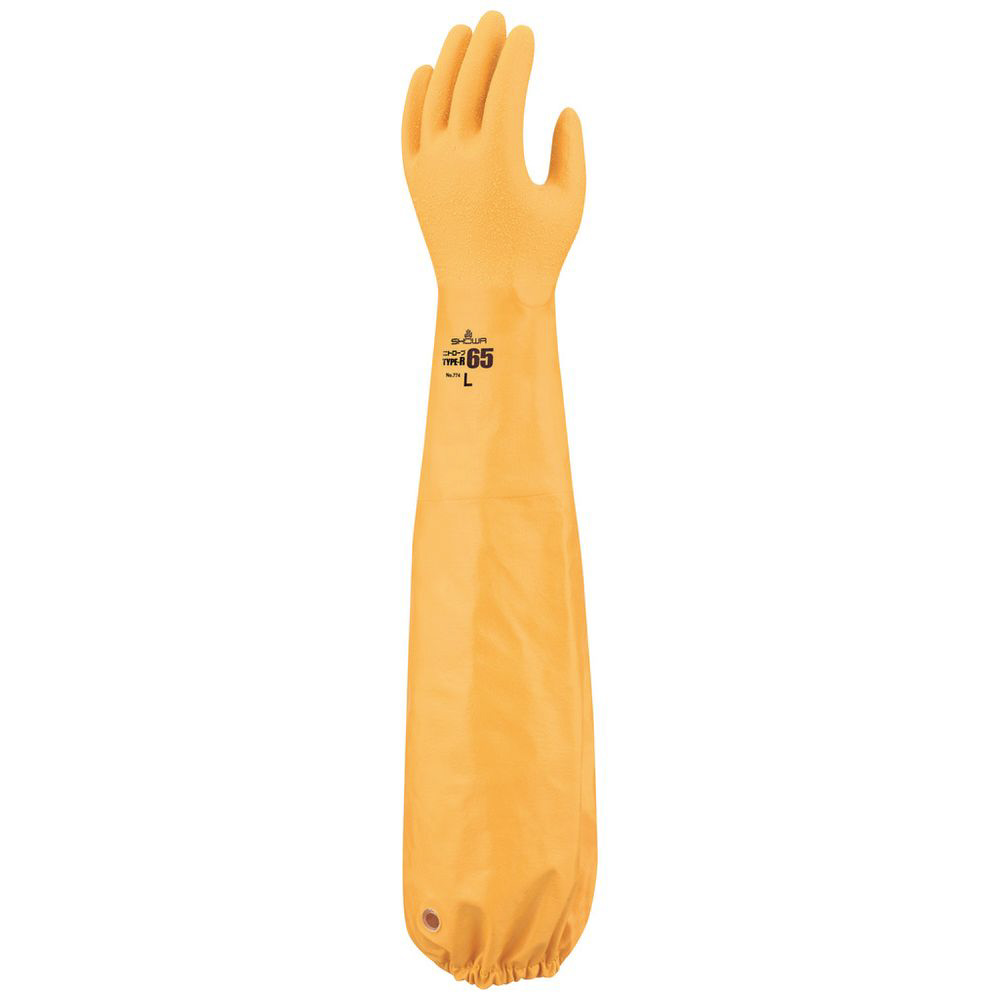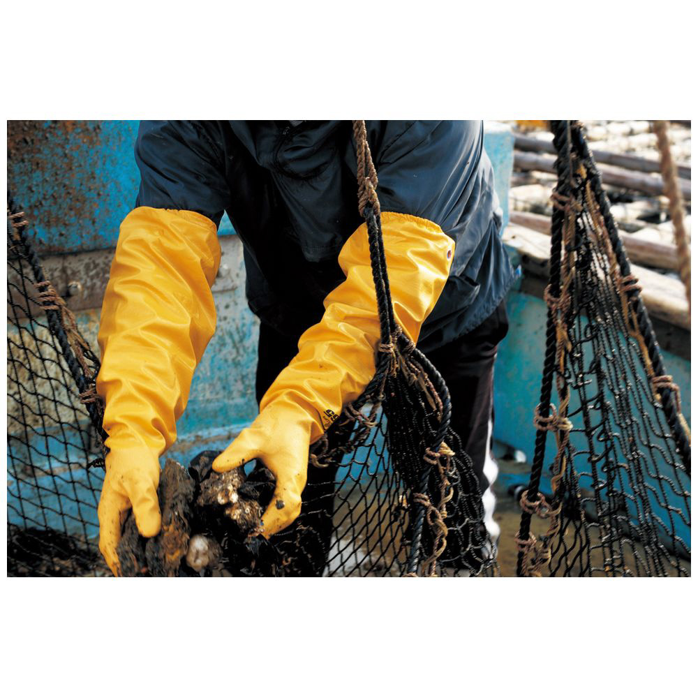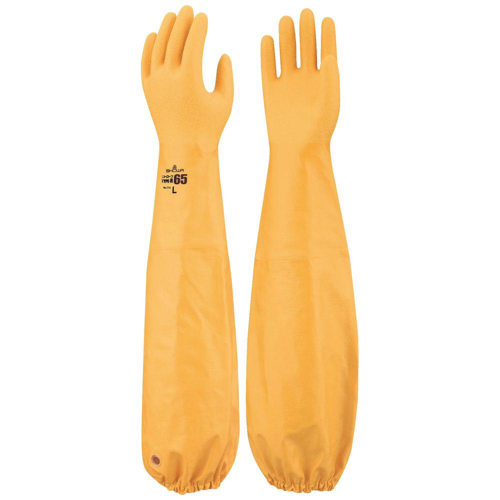 指先から肩口まで継ぎ目のない一体型ニトリル製ロング手袋です。