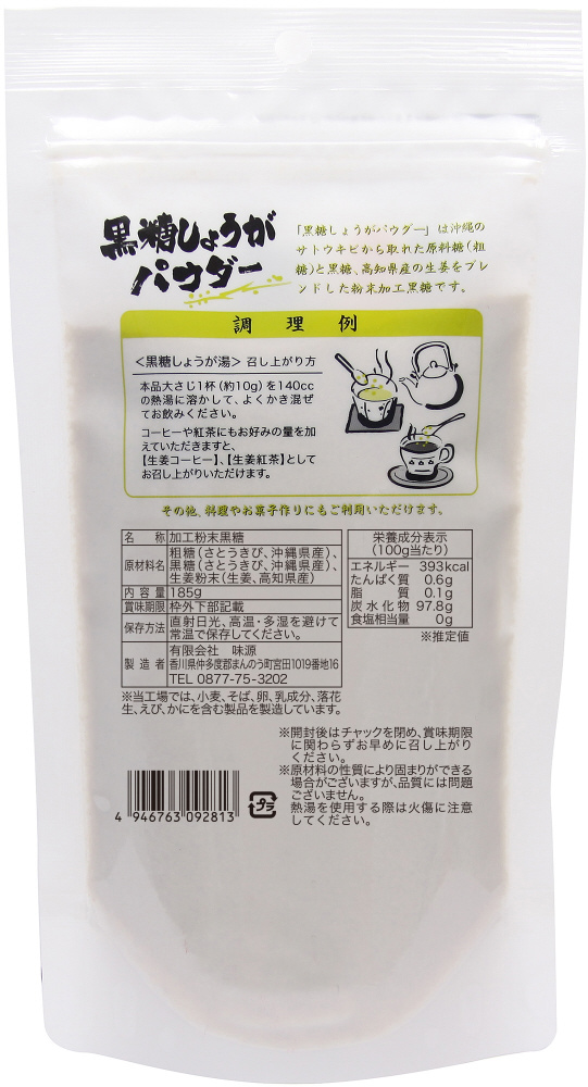 仕様1 原材料名: 粗糖(さとうきび、沖縄県産)、黒糖(さとうきび、沖縄県産)、生姜粉末(生姜、高知県産)