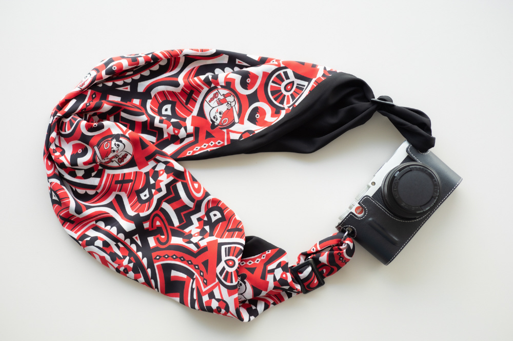 ストールの様な生地で作られているので、つけ心地、肌触りが良いカメラストラップ。