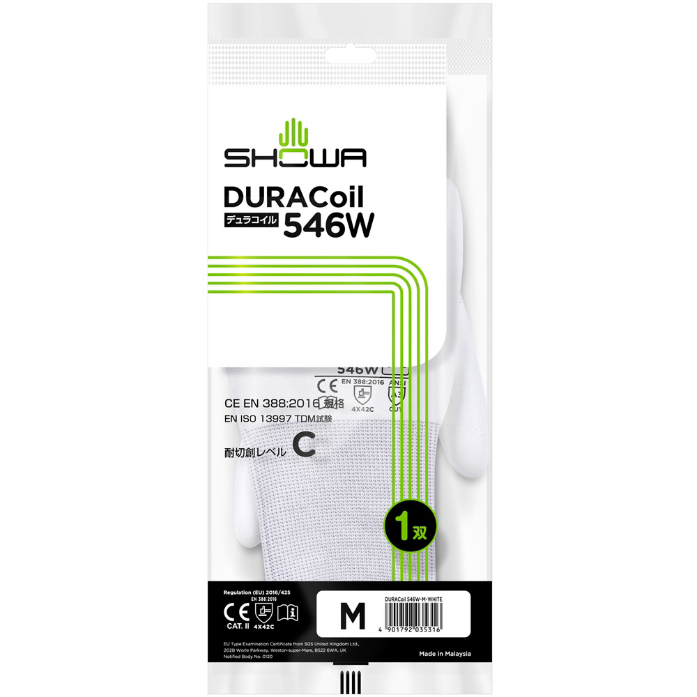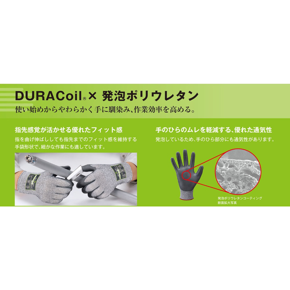 ■独自の繊維技術「デュラコイルテクノロジー」により耐切創性と作業性、肌触りのよさを両立しています。
