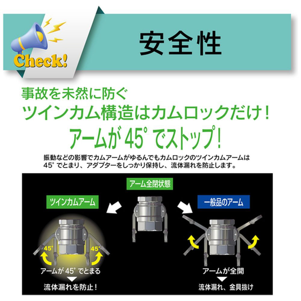 ■【安全性】 振動に強くカムアームがはずれにくい構造で、流体漏れを防止します。