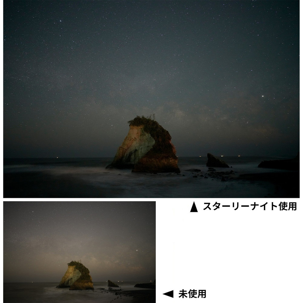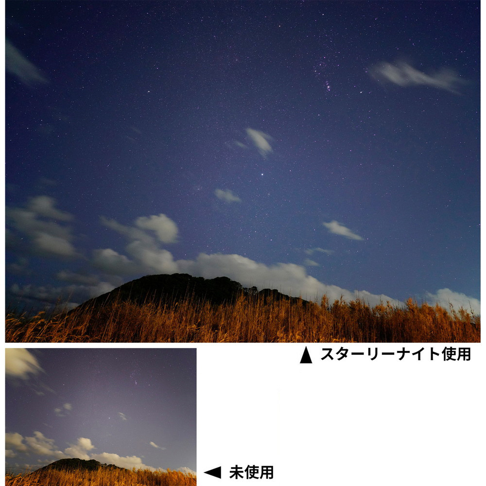 ●スターリーナイトは光害をカットするため、レンズに入る光量が減少します。スターリーナイトの露出倍数は1/3絞り分です。星空をマニュアル露出で撮影する場合、フィルター無しで撮影した時と同じ設定で撮ると露出アンダーになりますのでご注意ください。露出をプログラムオート(P)、絞り優先オート(A/Av)、シャッタースピード優先オート(S/Tv)に設定して、夜景などを撮影する場合はカメラ側で露出が調整されます。