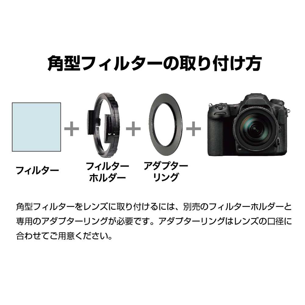 角型フィルターをレンズに取り付けるには、別売のフィルターホルダーとホルダー専用のアダプターリングが必要です。アダプターリングはレンズの口径に合わせてご用意ください。