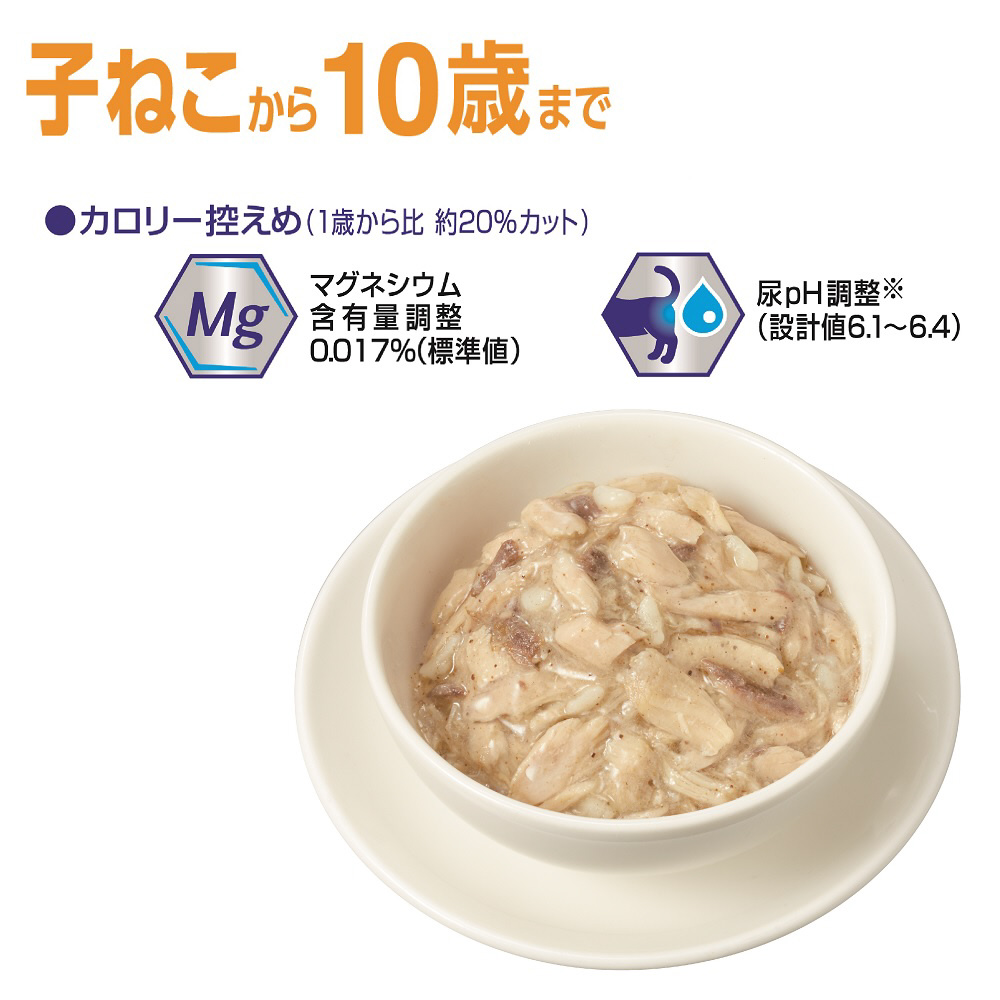 猫の下部尿路の健康維持に配慮した、年齢別プレミアムフード。ミネラルとアミノ酸のバランスを調整することで尿ペーハーをコントロール。