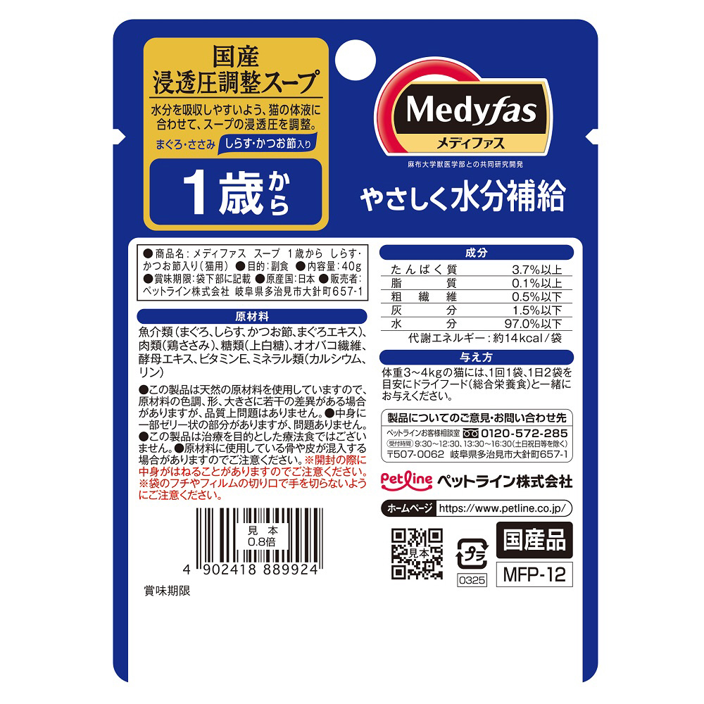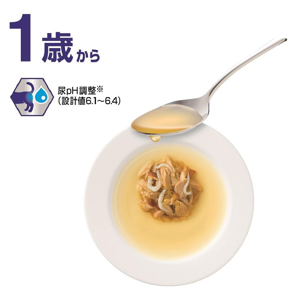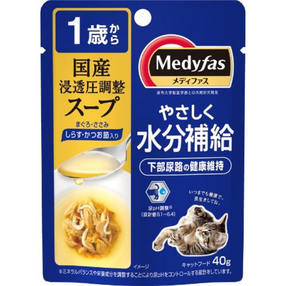 <メディファス>シリーズのスープパウチ。成長段階別の尿ペーハーコントロールで下部尿路の健康維持と浸透圧の調整で水分補給をサポート。しらすとかつお節入り。