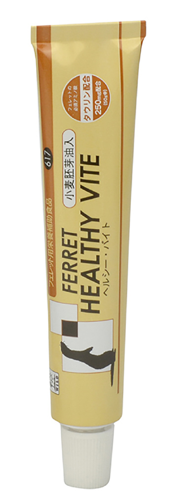 ・フェレット・ヘルシーバイトは、ビタミンE・F・必須脂肪酸など天然ビタミンを豊富に含む小麦胚芽油を主成分としており、フェレットの健康な体づくりに役立ちます。
