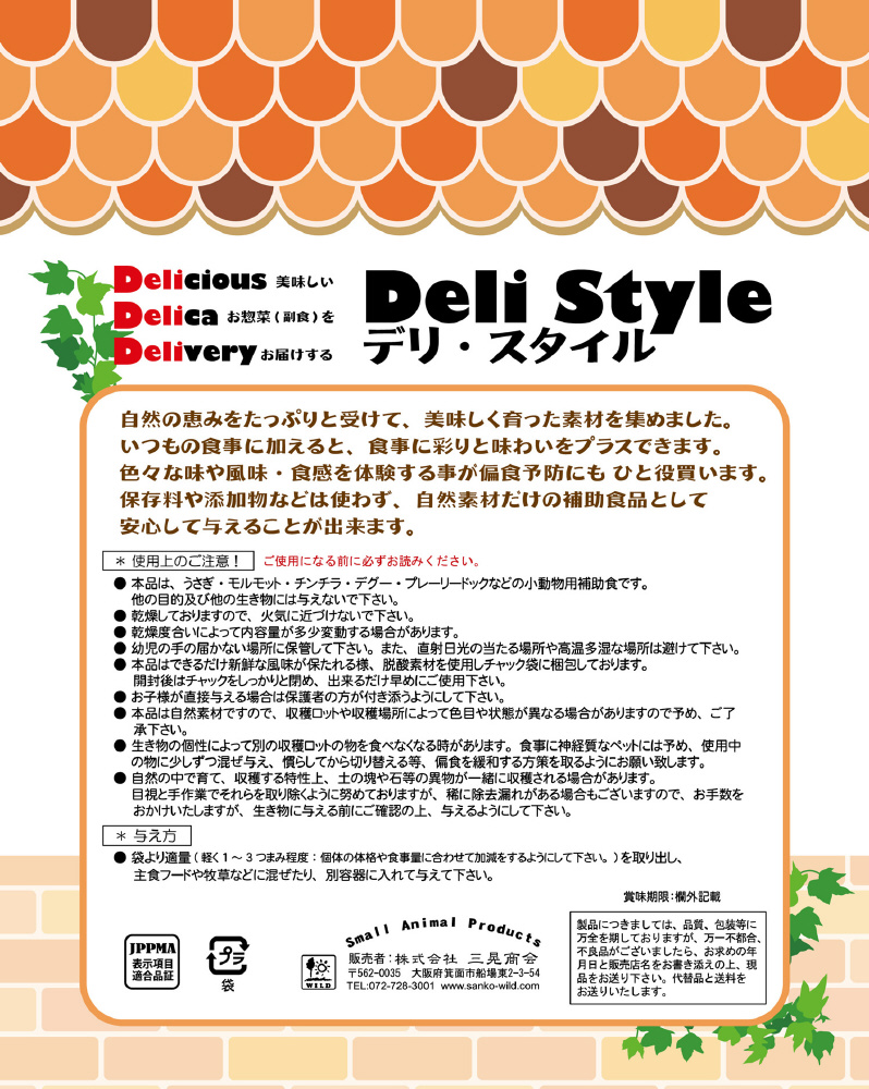 袋より適量(軽く1?3つかみ程度、個体の体格や食事量に合わせて加減するようにして下さい。)を取り出し、主食フードや牧草などに混ぜたり、別容器に入れて与えて下さい。