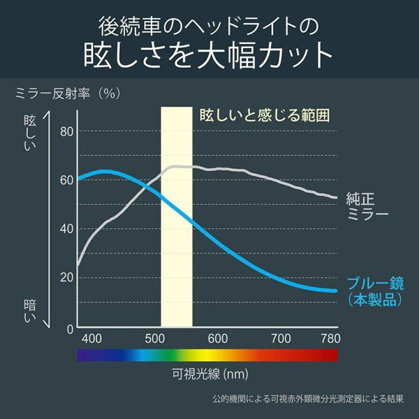 ・後続車のヘッドライトのまぶしさを大幅カットするブルーミラー仕様。防眩効果が高く、特にハイビームに
