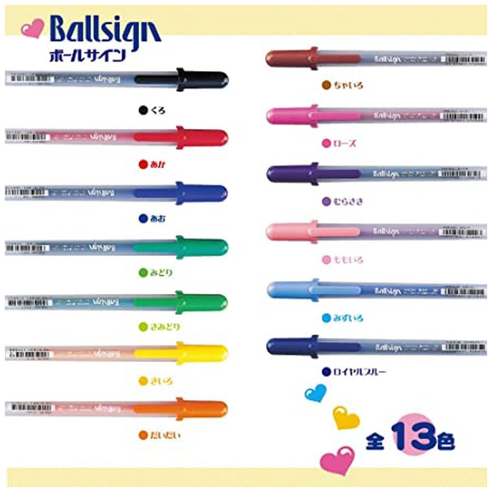 【ボールサインの6つの特徴】1なめらかな書き味2かすれ・途切れなし3水に流れず、色あせしない4ボタ落ちがなく、色鮮やか5強いペン先・カーボン複写OK!6残量のわかる透明ボディ【インク】水性顔料ゲルインキ/ボール径:0.6mm【単品サイズ】キャップ付き153×最大径9.5mm
