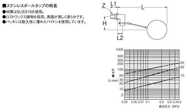 ●ステンレス玉付●最高使用温度120℃未満使用圧力0.1から0.5MPa●寸法図中の止水寸法は浮玉の中心を示しています。