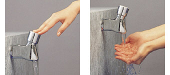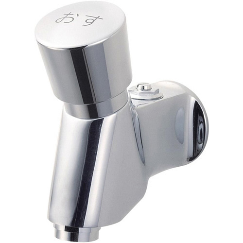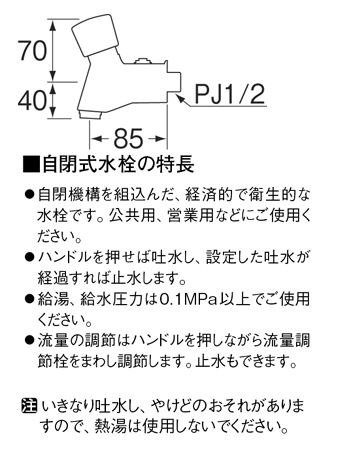 自閉式水栓の特長: ●自閉機構を組込んだ、経済的で衛生的な水栓です。公共用、営業用などにご使用ください。●ハンドルを押せば吐水し、設定した吐水が経過すれば止水します。●給湯、給水圧力は0.1MPa以上でご使用ください。 注: いきなり吐水し、やけどのおそれがありますので、熱湯は使用しないでください。