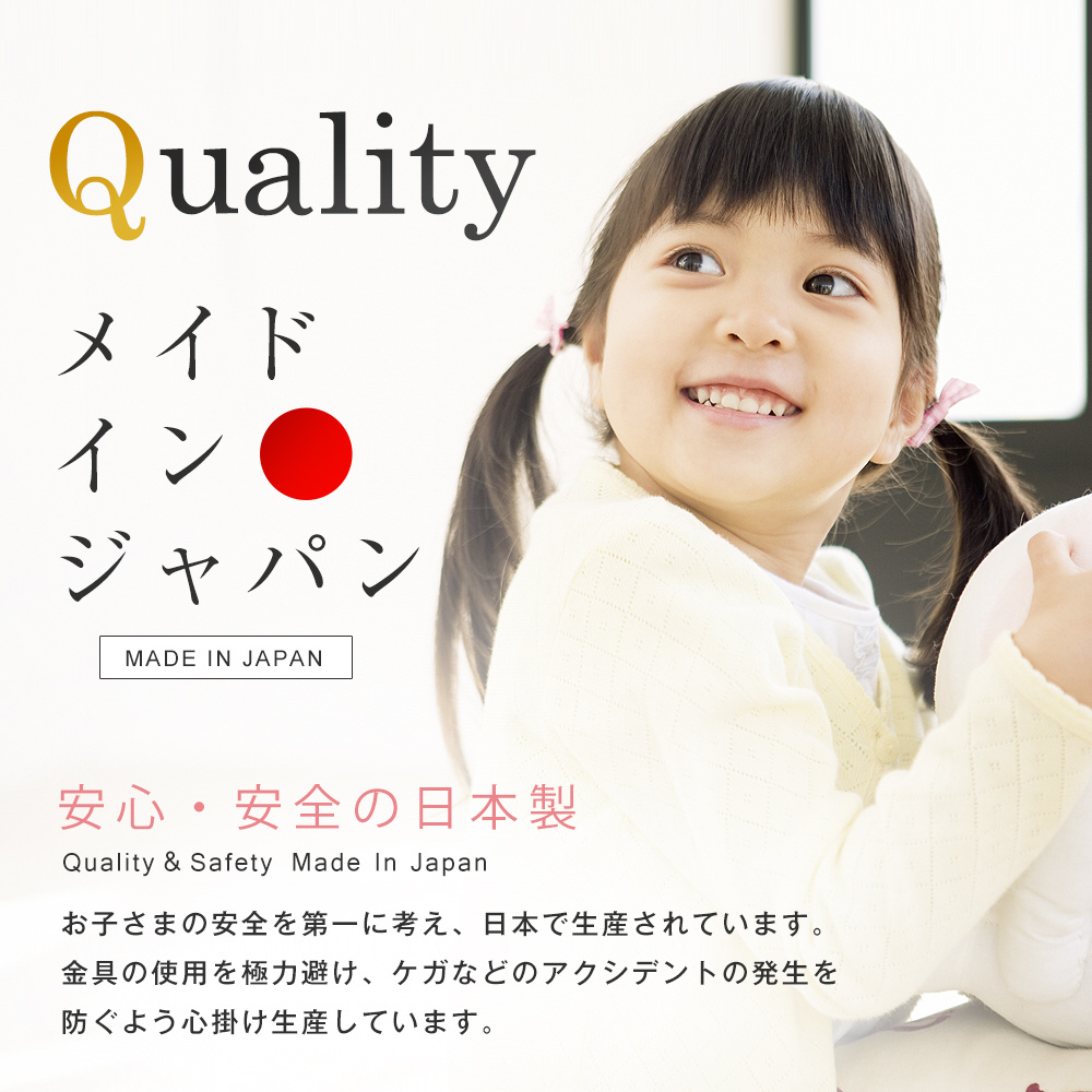 お子さまの安全を第一に考え設計されている為、金具の使用を極力避けケガなどアクシデントの発生を防ぐよう心掛けています。金具の使用を避ける事により、使用後のリサイクルも簡単です。