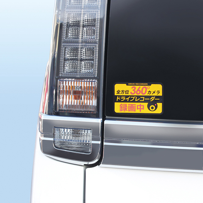 ウインドーガラスの外側に貼り、後続車に360°全方位ドライブレコーダー装着車であることを知らせることで、危険運転の抑制をアピール。