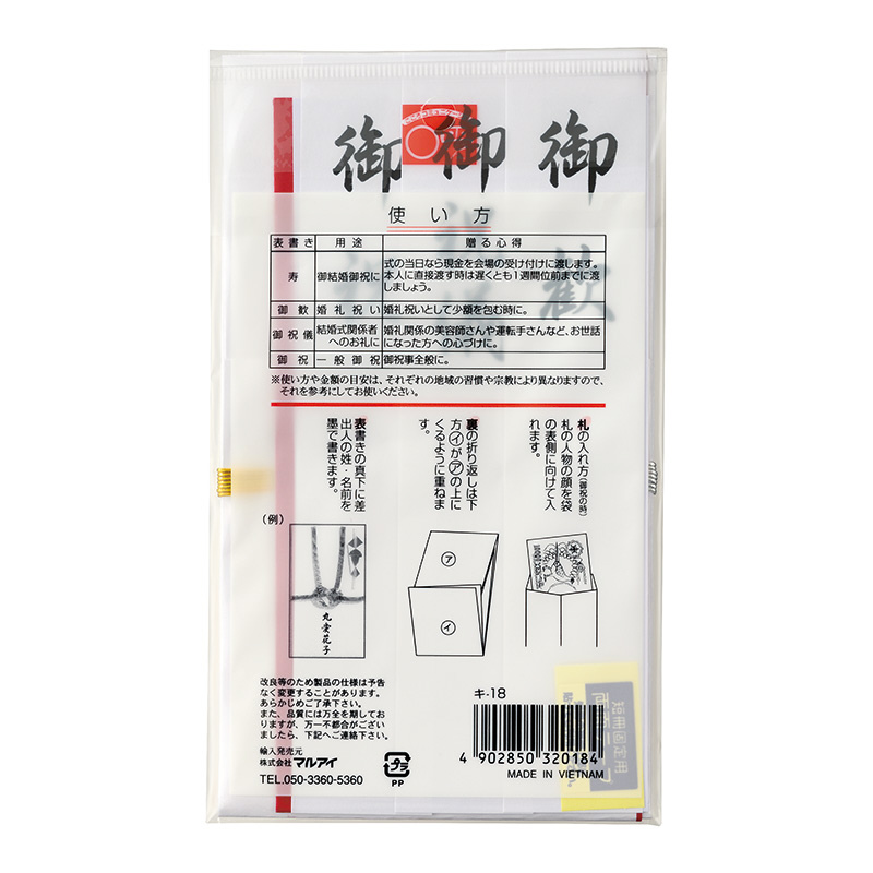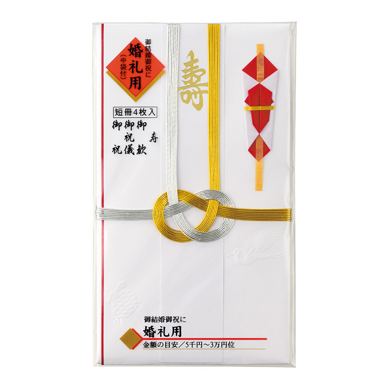 金封本体に鶴・亀模様を型押しした婚礼用金封です。金銀7本あわじ結び水引飾りを使用しています。金額の目安:1万円〜3万円くらいまで。サイズ:105×185mm。「寿」、「御歓」、「御祝儀」、「御祝」の短冊4枚入。短冊を使用せず、直接金封本体へ書くこともできます。中袋付1枚入。
