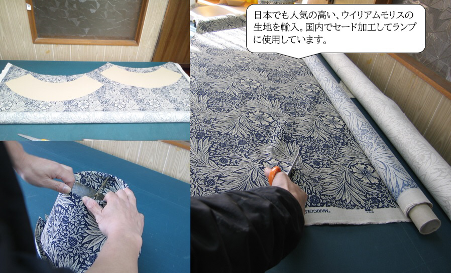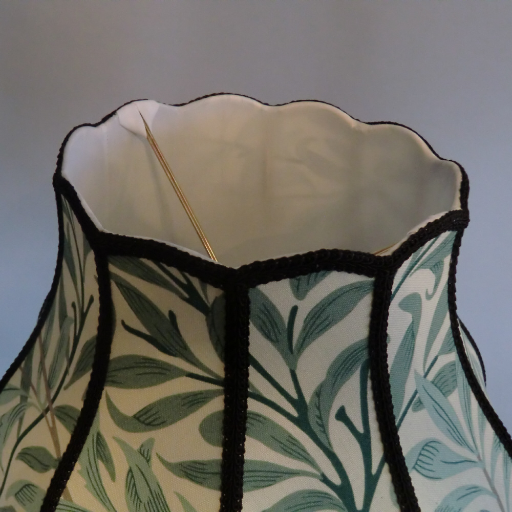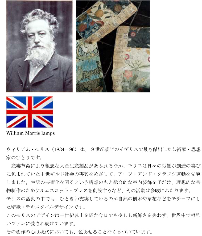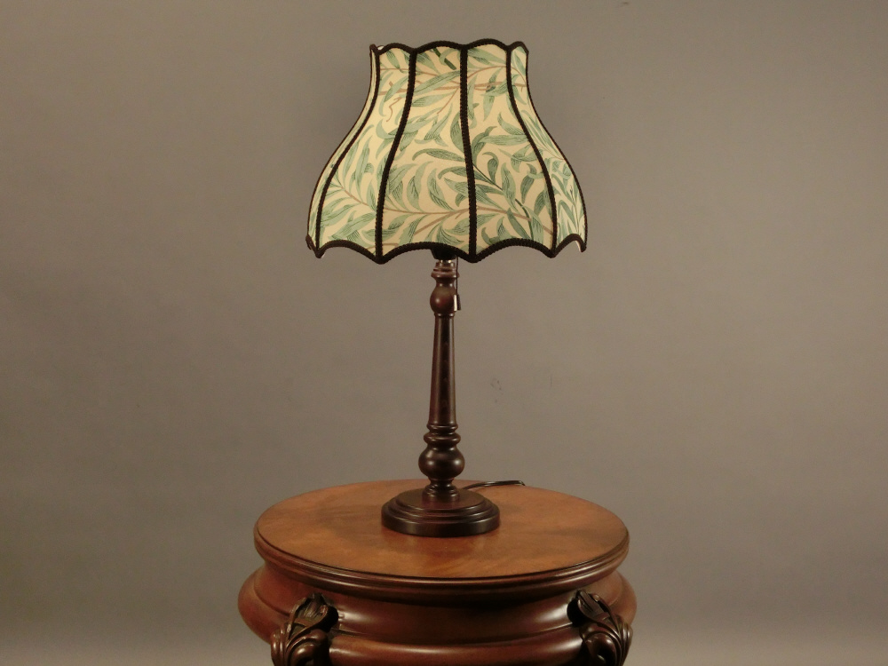 イギリスの芸術家、ウィリアム・モリスのデザイン生地をシェードに使用した、インテリアテーブルランプ。