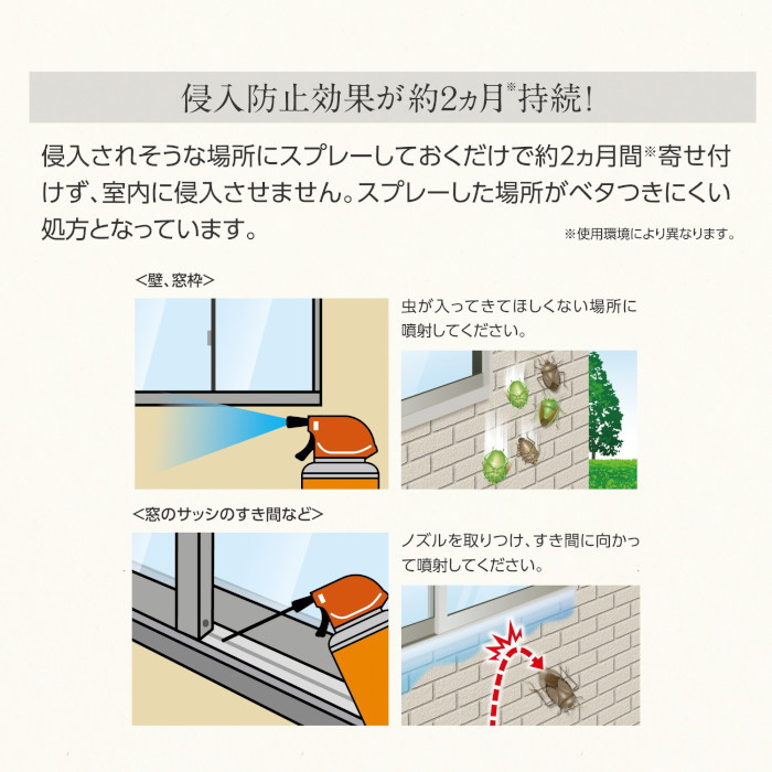 壁、窓枠:虫が入ってきてほしくない場所に噴射してください