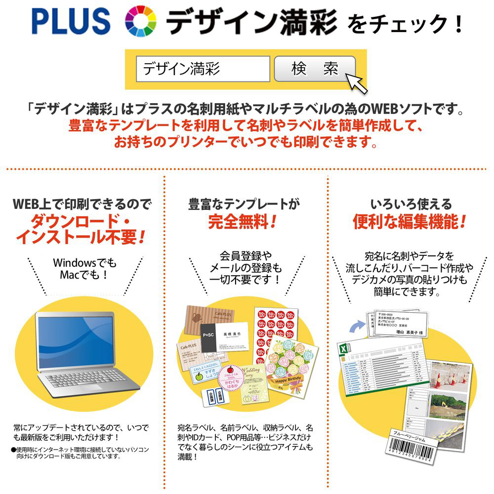 ・プラスのホームページには、名前や内容表示ラベル、価格やJANラベル、また注意表記、サインラベルを簡単に作ることのできる無料ソフト「デザイン満彩」をご用意しております。