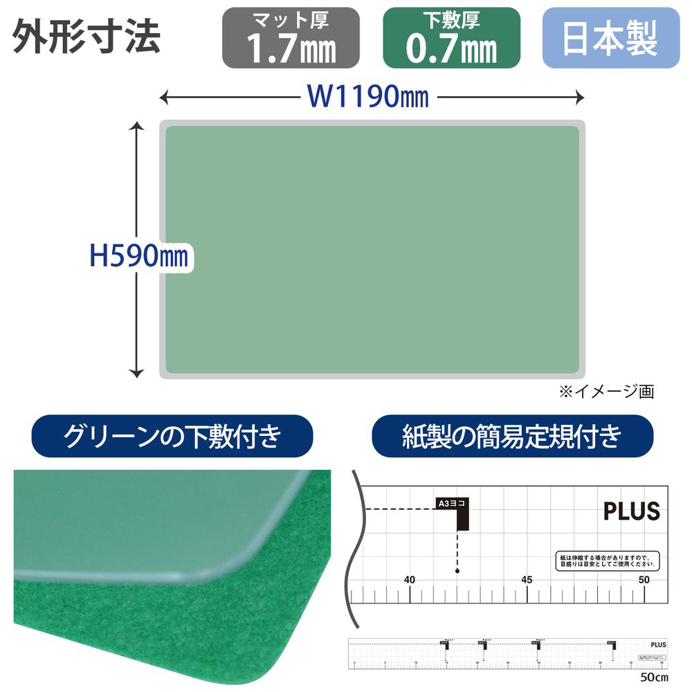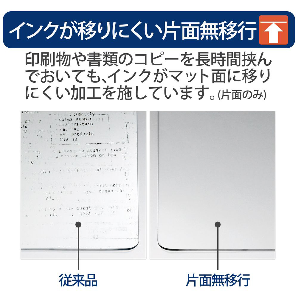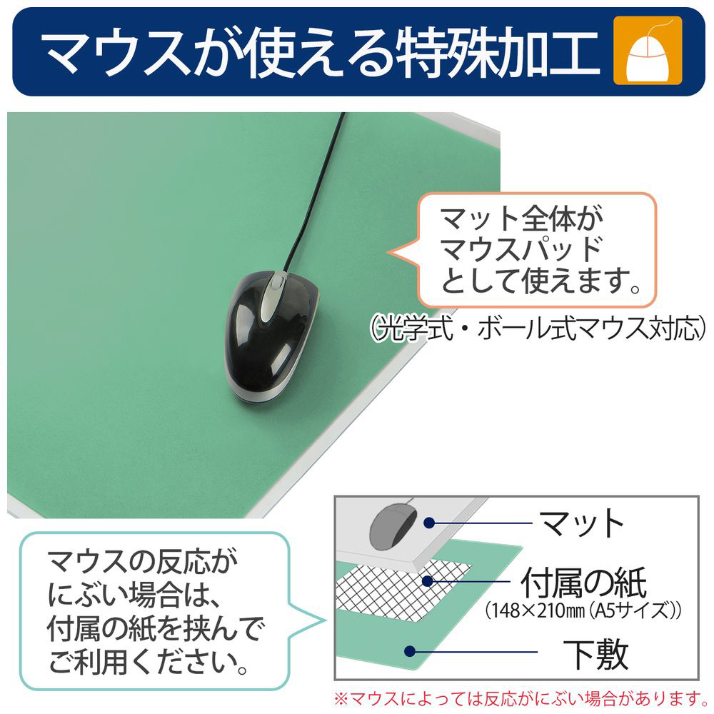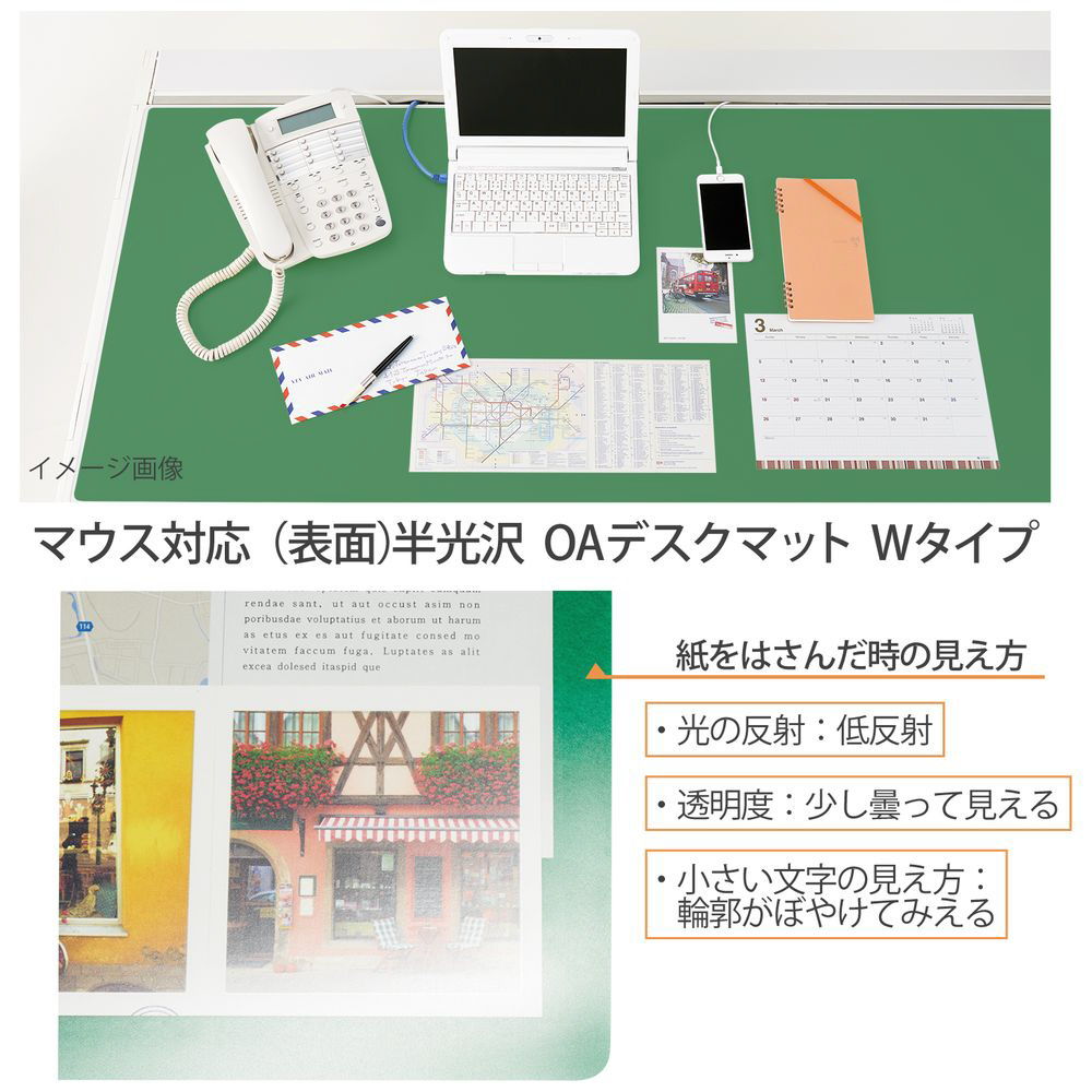 ・傷や汚れから机を守る、デスクマット。・コードインスペースのある机に対応。配線しやすい奥行きが短いタイプのデスクマット。・特殊表面加工でマット全体がマウスパッドとして使用できる、OA環境に適したデスクマットです。(光学式・ボール式マウス対応)・マット表面は、光の反射を抑え、挟んだものが見えやすい半光沢タイプ。(ノングレア(シボ)タイプ)・片面無移行(非転写)タイプで、印刷物や書類のコピーを長期間はさんでおいても、インクがマット面に移りにくい加工を施したデスクマット(片面のみ)。キレイにご使用いただけます。・コードインスペース対応で、OAデスク奥のコードインスペースに配慮して、奥行きが10cm短いタイプです。・デスクマットのエッジを斜めカット加工しているので、長時間の作業でも手が痛くなりにくいマットです。・ ※マット表面にシボがかかっています。・※マウスによっては反応がにぶい場合があります。・※ 上部マットと下敷は接合せず、別々です。・※デスクマットは素材の特性(縮みやすい材質)により、寸法に若干の誤差が生じます。