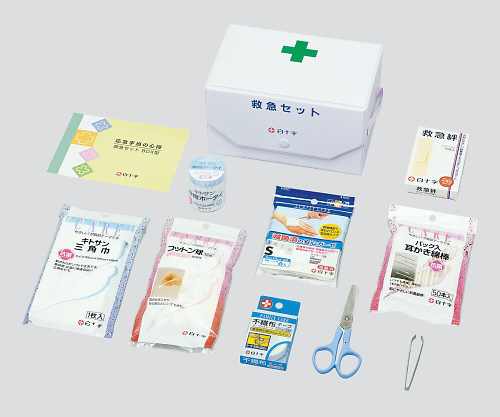 セット内容: コットン球 、伸縮ホータイ 、綿棒 、サージカルテープ 、毛ヌキ 、ガーゼ 、三角巾 、絆創膏 、はさみ 、冊子「応急手当の方法」