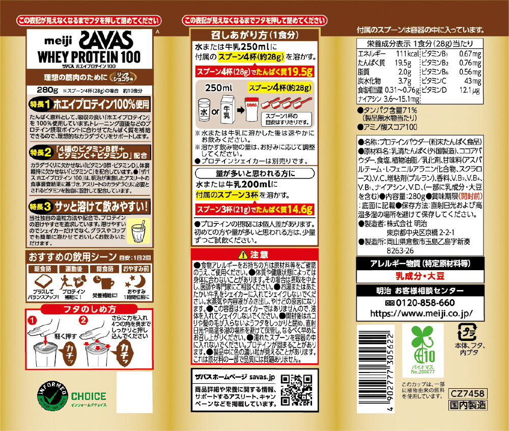 原材料 乳清たんぱく、ココアパウダー、食塩、植物油脂/乳化剤、甘味料(アスパルテーム・L-フェニルアラニン化合物、スクラロース)、V.C、増粘剤(プルラン)、香料、V.B2、V.B6、V.B1、ナイアシン、V.D、(一部に乳成分・大豆を含む)
