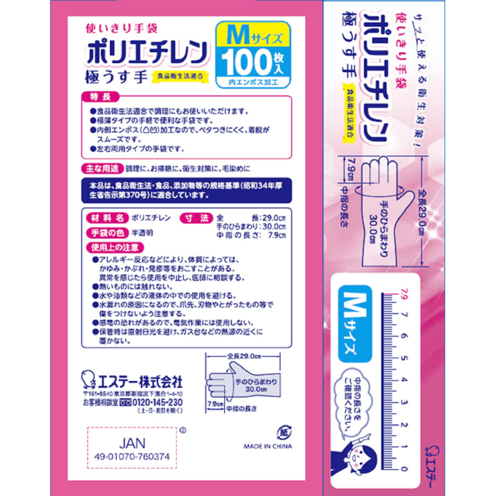 使いきり手袋 ポリエチレン 極うす手 Mサイズ 半透明 100枚 [使い捨て手袋 食品衛生法適合 左右両用タイプ 調理 掃除 衛生対策 毛染め] 半透明
