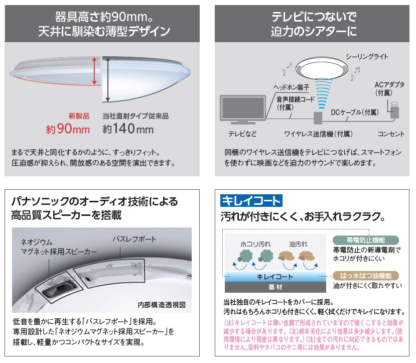 慣れ親しんだ丸型デザイン。厚さ90mmの薄型で天井にすっきり溶け込む。Bluetoothスピーカー搭載でテレビなどの音声を天井から再生、光と音に包まれる新体験を演出。よりシンプルな操作を可能にする赤外線リモコン対応 。汚れがつきにくくお手入れらくらく「キレイコート」。小さな文字もくっきり読みやすい「文字くっきり光」搭載。